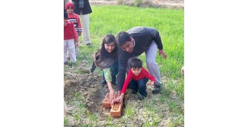 Image: Pooja, Shashank and their son laying the foundation stone for the school building